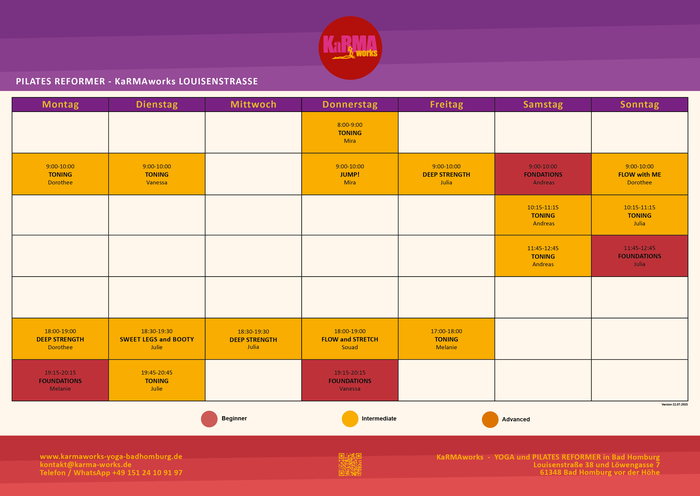 Hier findest du alle Infos für dein Pilates Reformer Training bei KaRMAworks: aktueller Kursplan, Beschreibung der Kurse, einen Blick in unser Studio und lerne unsere Trainer kennen. KaRMAworks YOGA und PILATES REFORMER seit 2019 in Bad Homburg.
